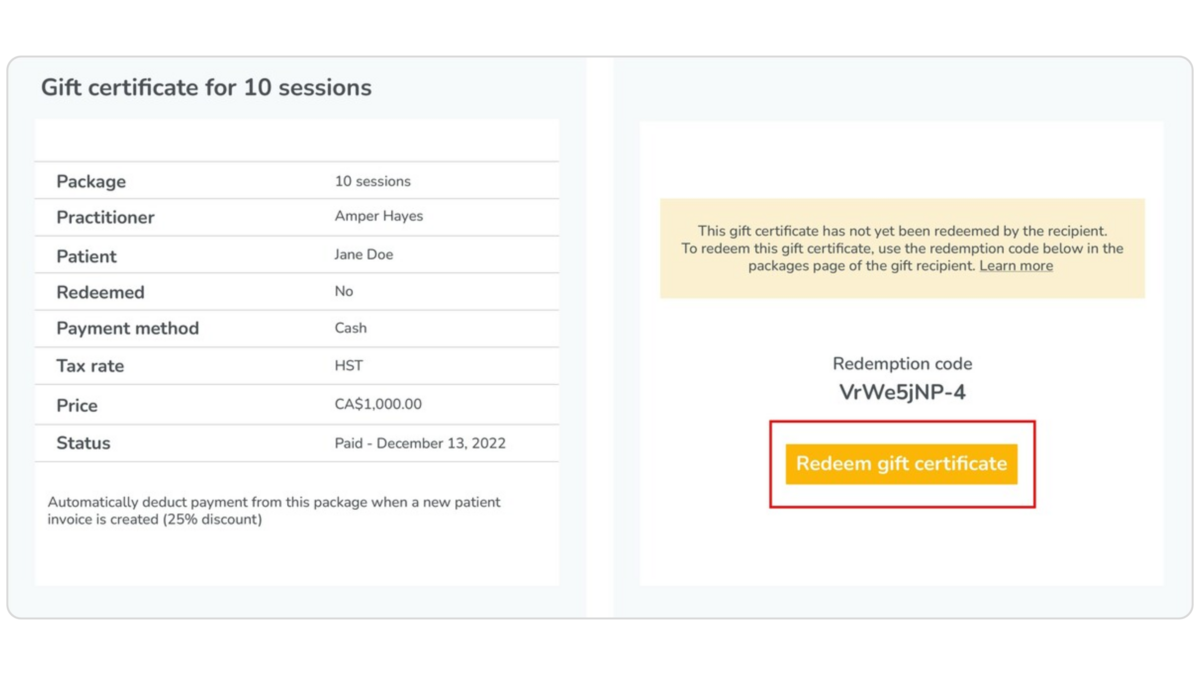 - Gift certificates are a type of package paid for by one patient and redeemed by another. The person purchasing a gift certificate cannot use it for themselves.